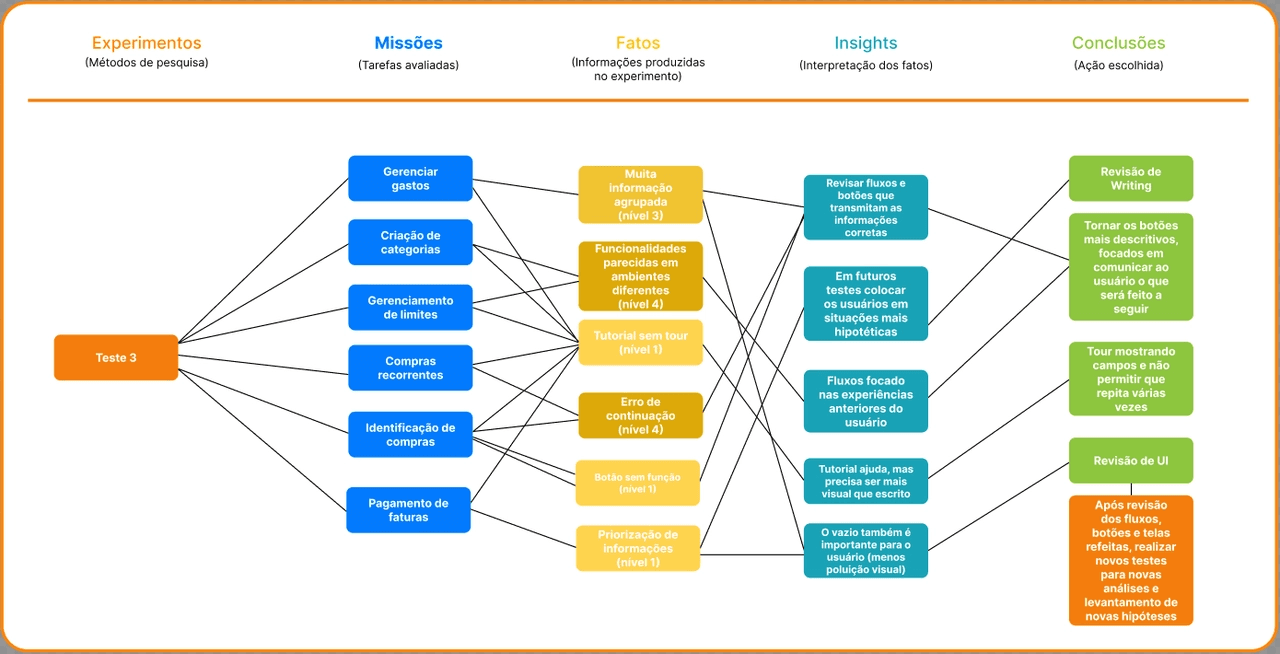 Foi observado que os usuários utilizam mais ferramentas externas, como planilhas digitais, do que o aplicativo do banco para gerenciar seus gastos.